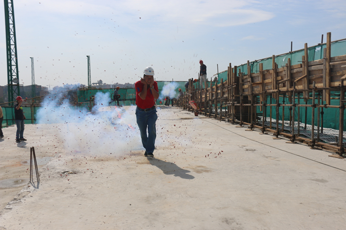 封頂儀式上云南體育運(yùn)動(dòng)職業(yè)技術(shù)學(xué)院院長(zhǎng)李錫云及書(shū)記陳麟在結(jié)構(gòu)屋面層點(diǎn)燃了鞭炮以祝賀綜合訓(xùn)練館1軸-10軸/L軸屋面斜梁完成了最后一方混凝土的澆筑,這也預(yù)示著項(xiàng)目正式轉(zhuǎn)入二次結(jié)構(gòu)及裝飾裝修施工階段。