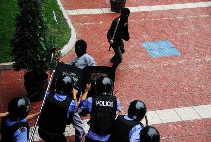 “黑林鋪派出所,黑林鋪派出所,五公司受到暴恐襲擊,請(qǐng)火速支援,請(qǐng)火速支援!”8月15日上午10點(diǎn)多,一輛面包車突然沖進(jìn)公司大門,車上跑下來四名手持長(zhǎng)刀及斧頭的蒙面“恐怖分子”,公司保衛(wèi)部立即組織職工撤回機(jī)關(guān)辦公樓進(jìn)行防御,并第一時(shí)間請(qǐng)求黑林鋪派出所進(jìn)行支援。
