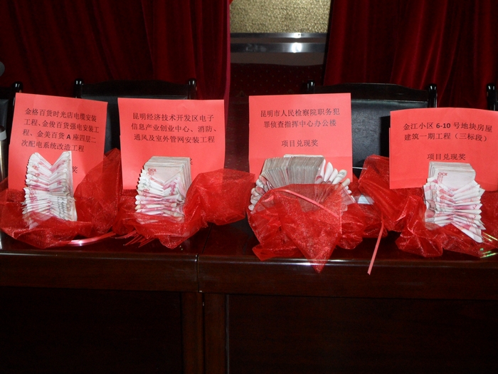 第一安裝直管部本次兌現(xiàn)的項目分別是:昆明市人民檢察院職務犯罪偵查指揮中心辦公樓安裝工程,兌現(xiàn)金額172407.03元;金江小區(qū)6#-10#地塊房屋建筑工程第三標段安裝工程,兌現(xiàn)金額70253.63元;金美百貨等改造工程,兌現(xiàn)金額17112.28元;昆明經濟技術開發(fā)區(qū)電子信息產業(yè)創(chuàng)業(yè)中心消防、通風及室外管網工程,兌現(xiàn)金額100000元。四個項目在大會上獲得了相應的現(xiàn)金兌現(xiàn)。