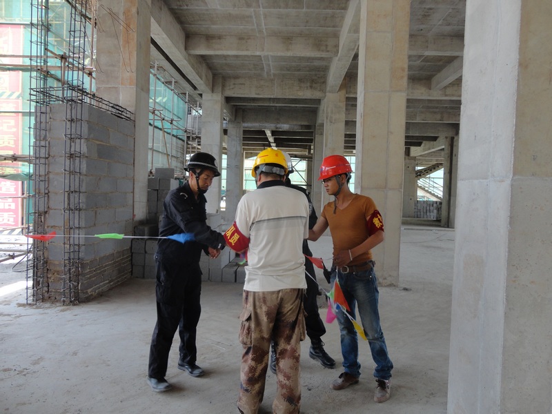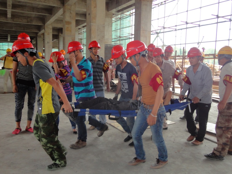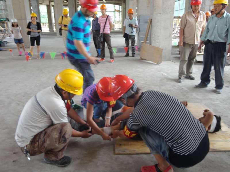 “事故”發(fā)生后,項目部安全員李福第一時間向項目部經(jīng)理董波匯報,董波立即向上級部門匯報情況,并撥打了120急救電話,隨后立即指揮應(yīng)急救援小組開展救援。現(xiàn)場保衛(wèi)人員拉起警戒線維持現(xiàn)場,搶救小組趕到事故現(xiàn)場拆除坍塌模板解救受傷人員,并對傷員傷口進行簡單的處理與包扎,等待救護車的到來……整個演練過程歷時二十多分鐘,大家有條不紊地參與了整個救援過程。