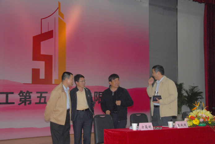 集團(tuán)董事長(zhǎng)、黨委書記納杰(右),黨委副書記、紀(jì)委書記張戰(zhàn)國(guó)(左)與公司董事長(zhǎng)、黨委書記楊福和(右二),總經(jīng)理方菊明(左二)在課間休息時(shí)交談