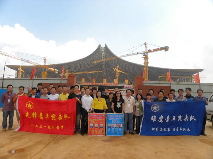 雛鷹隊得名來自于航站樓外觀,隊員為東施工區(qū)18名青年人。突擊口號為“樹東區(qū)形象,展青年風采”。先鋒隊隊員為西施工區(qū)20名青年,突擊口號“一二三一起向前沖”,寓意“12?31”節(jié)點大家一起努力實現(xiàn)。兩個突擊隊分別設(shè)計和定制了自己的隊旗和徽章。