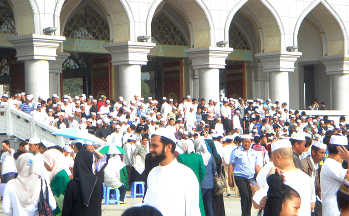 凌晨八點(diǎn),新建大清真寺外的和諧廣場(chǎng)聚集了二萬(wàn)余人,全國(guó)乃至海外的眾多穆斯林慕名而來(lái)共同歡慶今年的開(kāi)齋節(jié),可謂盛況空前。大家都盼著能在這全國(guó)乃至東南亞最高的清真寺第一次舉辦的開(kāi)齋節(jié)虔誠(chéng)禮拜。中央電視臺(tái)、云南電視臺(tái)也聯(lián)袂來(lái)到“開(kāi)齋節(jié)”現(xiàn)場(chǎng)。