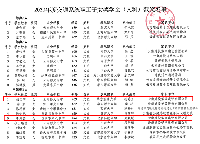 9月11日,2020年度云南省公路學(xué)會(huì)職工子女考入重點(diǎn)院校獎(jiǎng)學(xué)金評(píng)審結(jié)果發(fā)布,公司申報(bào)的兩名職工子女分均獲得文科類(lèi)三等獎(jiǎng),獲得獎(jiǎng)學(xué)金1200元。 2020年職工子女獎(jiǎng)學(xué)金理工類(lèi)申報(bào)評(píng)獎(jiǎng)的起點(diǎn)線定為625分,文史類(lèi)申報(bào)評(píng)獎(jiǎng)的起點(diǎn)線為620分,并被重點(diǎn)院校錄取的交通系統(tǒng)(含外系統(tǒng)公路學(xué)會(huì)團(tuán)體會(huì)員單位)職工子女考生中擇優(yōu)評(píng)獎(jiǎng)。安一部職工楊瓊芳女兒胡佳琪,以高考成績(jī)647分...