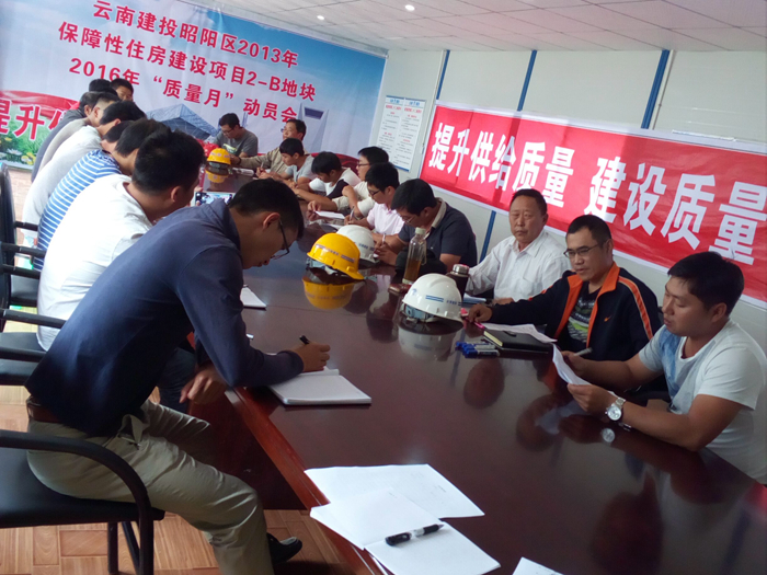 2016年9月13日下午,昭通市昭陽區(qū)2013年保障性住房建設(shè)項(xiàng)目2—B地塊質(zhì)量月活動啟動儀式在項(xiàng)目現(xiàn)場舉行。公司五〇七直管項(xiàng)目部、第五直管項(xiàng)目部、第九直管項(xiàng)目部、第二安裝項(xiàng)目部的管理人員參加了啟動儀式。 活動宣傳了今年質(zhì)量月主題——“提升供給質(zhì)量,建設(shè)質(zhì)量強(qiáng)國”,闡述了施工質(zhì)量與施工安全、經(jīng)濟(jì)、工期的關(guān)系,強(qiáng)調(diào)了施工質(zhì)量...